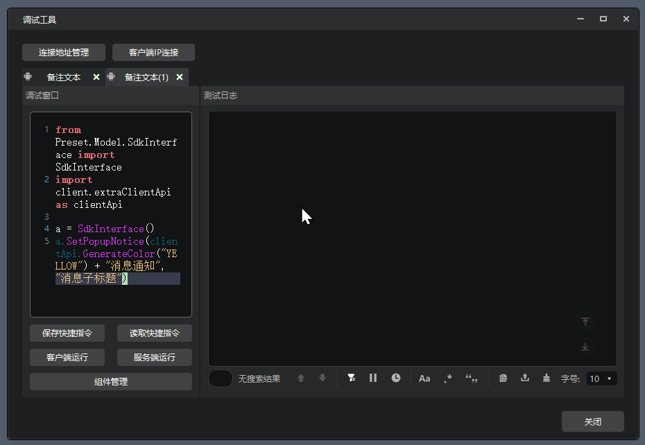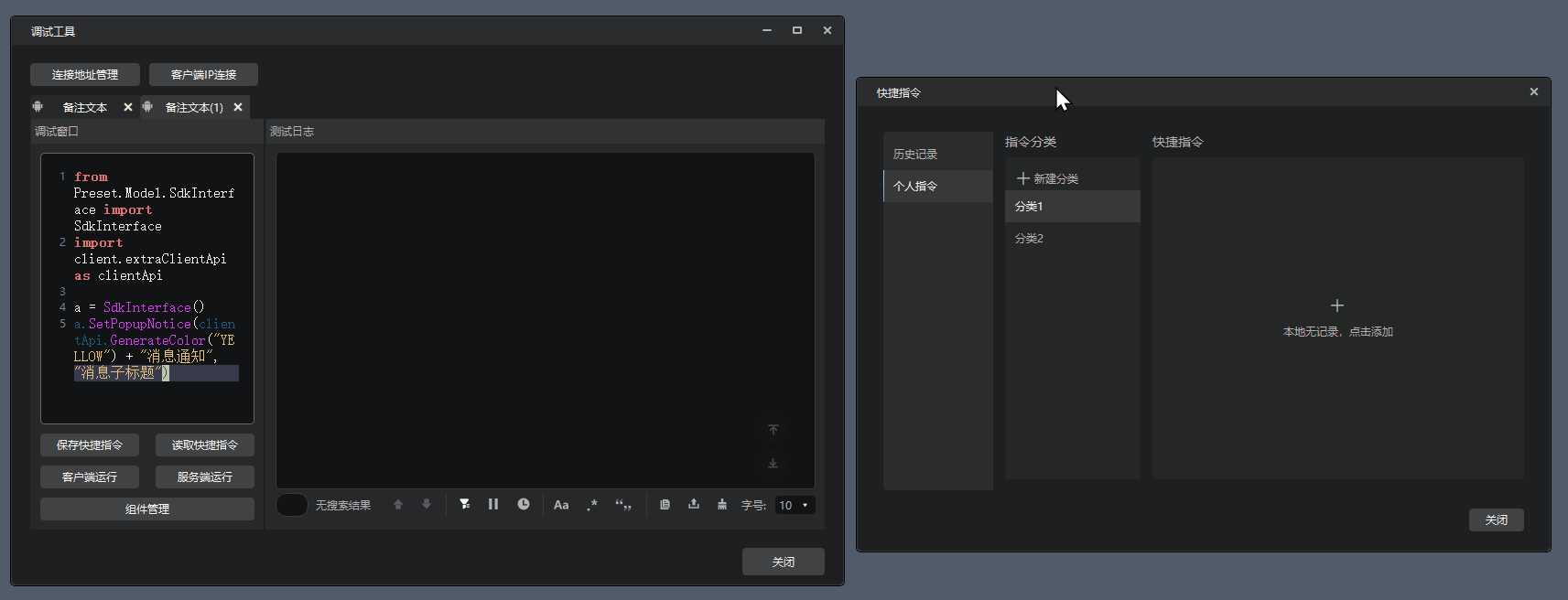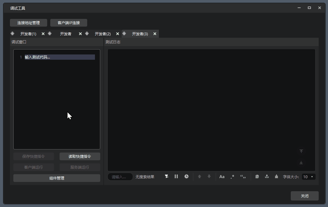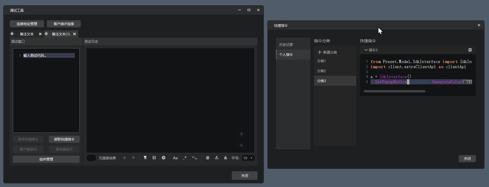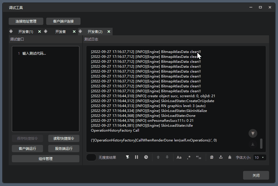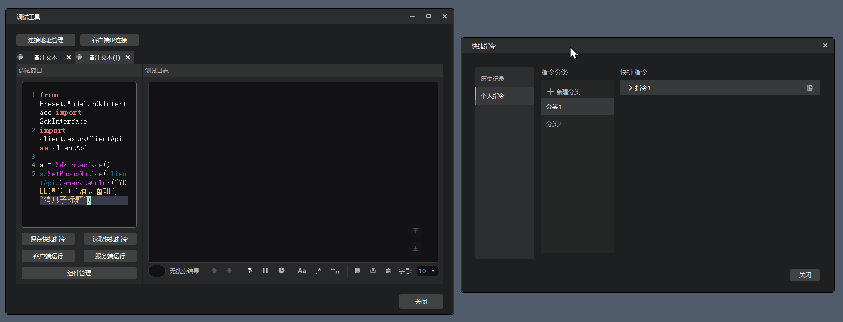 - 调试窗口:汇集多个重要调试功能于一体,主要包括: ① 输入python调试代码在客户端/服务端运行; ② 查看指令历史记录,同时还能将指令保存为快捷指令便于后续重复使用; ③ 上传文件/文件夹至手机测试服组件目录,或从客户端下载文件; ④ 将PC端对组件源文件的修改直接同步至手机测试服。