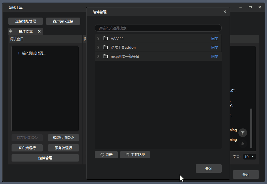 首先,我们可以点击左侧调试窗口的【组件管理】按钮,打开管理窗口。这里会展示我们测试客户端上装载过的所有组件。