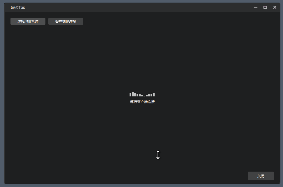 对于连接手机测试客户端的情况: 打开调试工具后,我们会看到如下界面。由于尚未连接测试客户端,我们只能看到两个连接选项按钮,以及“等待客户端连接”的提示信息。