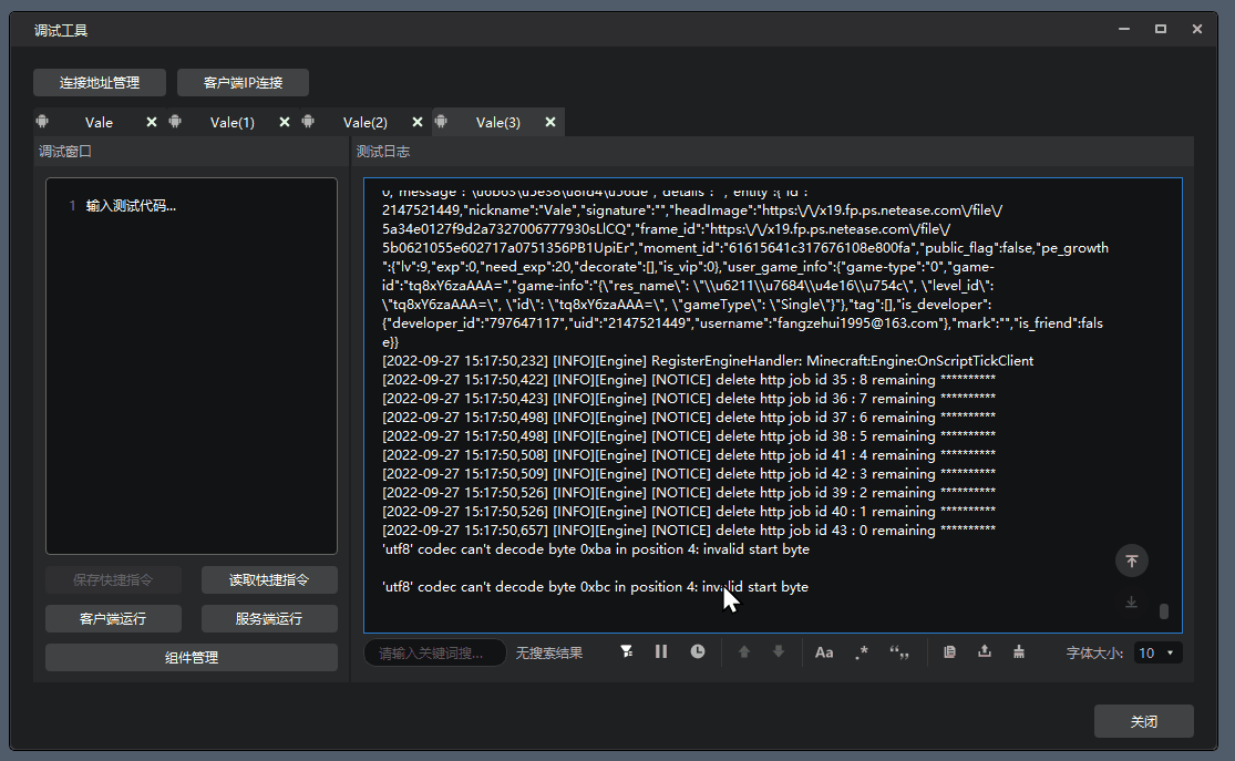 - 指令调试:对正在进行中的游戏测试进程直接使用python代码进行调试,并且提供代码补全功能。